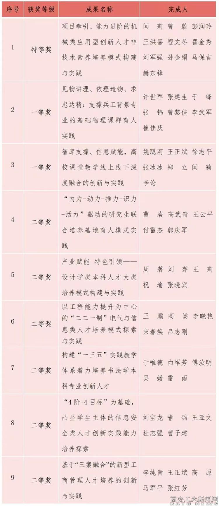 随着各项措施落地生根,学校获得省级教学成果奖9项,获得全国高校教师教学创新大赛国赛一等奖1项、二等奖1项,获得全国第三届金工/工训青年教师微课教学竞赛一等奖1项,获评中国电子学会(国家一级学会)2021年度优秀硕士学位论文1篇,获评中国复合材料学会优秀硕士学位论文提名奖1项。