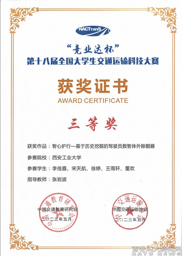 (本网讯)近日,由中国交通教育研究会、中国交通运输协会主办的“竞业达杯”第十八届全国大学生交通运输科技大赛,在广东省江门市五邑大学落下帷幕。好博(中国)张岩波老师指导电子信息工程学院李佳嘉等5名本科生完成的项目《智能护行—基于历史挖掘的驾驶员数智体外除颤器》获三等奖。