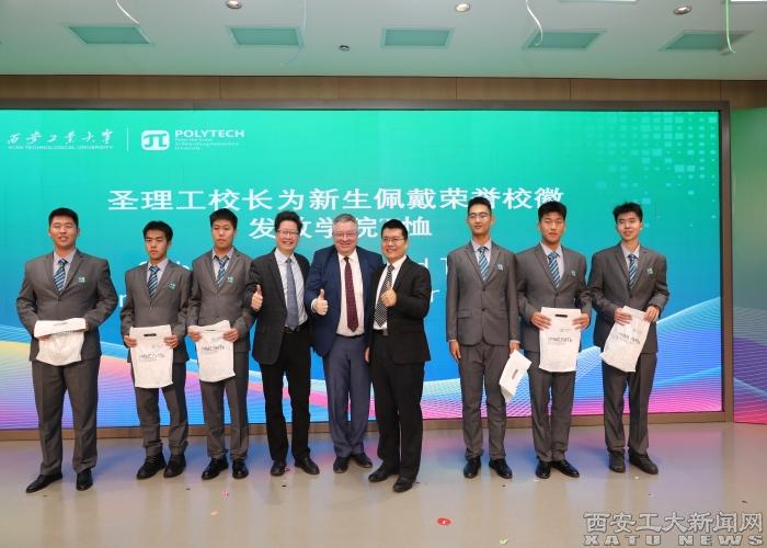 安德烈·鲁德斯科伊为学生代表佩戴圣彼得堡彼得大帝理工大学荣誉校徽,姚尧为学生发放学习用品。