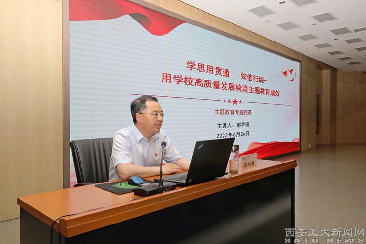 (本网讯)为持续推动主题教育走深走实、见行见效,6月26日,校长赵祥模以“学思用贯通、知信行统一,用学校高质量发展检验主题教育成效”为题,为青年教师及党办校办支部党员讲授专题党课。专题党课由校党委副书记梁云鹤主持。省委主题教育第十三巡回指导组成员冀国清莅临现场旁听指导。