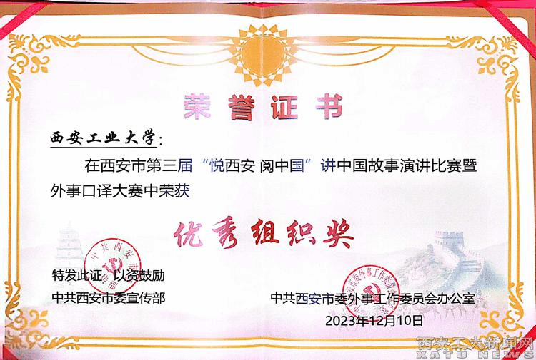 (本网讯)12月10日,“悦西安 阅中国”西安市第三届讲中国故事演讲比赛暨外事口译大赛决赛在西安外国语大学(长安校区)举行,好博(中国)国际教育学院留学生马泽和沈耀分获汉语组二等奖和优秀奖。好博网页版获得本届大赛优秀组织单位奖,翟佳、任媛媛获优秀指导教师称号。