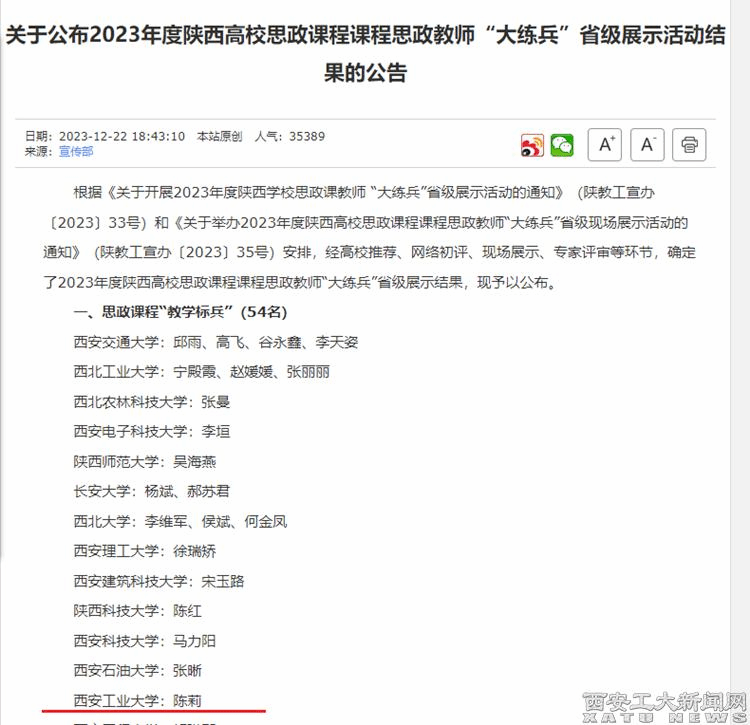 (本网讯)近日,由中共陕西省委教育工委、陕西省教育厅组织的2023年度陕西高校思政课程与课程思政教师“大练兵”省级现场展示活动在西北工业大学友谊校区举行。好博(中国)马克思主义学院教师陈莉获得“教学标兵”称号,马克思主义学院杨婧,电信学院王珊珊2名教师获得“教学能手”称号。