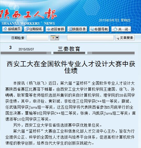 西安工大在全国软件专业人才设计大赛中获佳绩(20150507《陕好博网页版人报》)